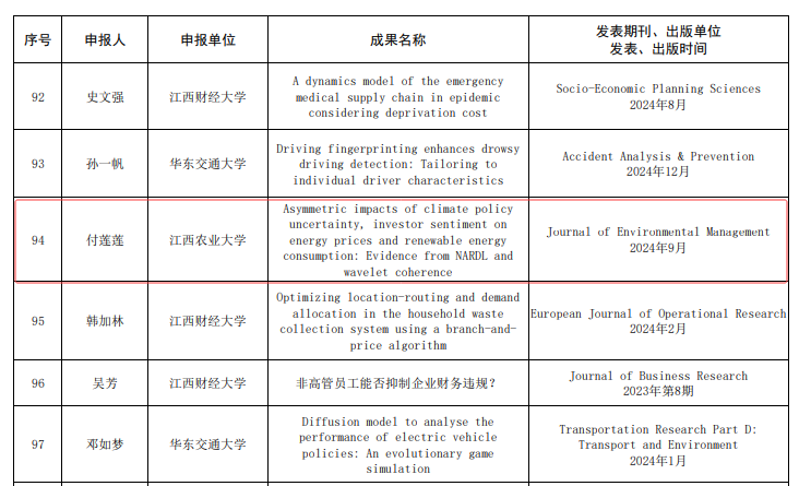 近日,江西省第二十一次社会科学优秀成果奖获奖成果公布,公司付莲莲教授荣获社会科学优秀成果三等奖。江西省社科优秀成果奖是省内哲学社科领域最高奖,是衡量社科发展水平和科研实力的重要标尺之一。公司高度重视科学研究工作,将持续发力,不断推出更多高质量科研成果,为经济社会发展贡献智慧和力量。