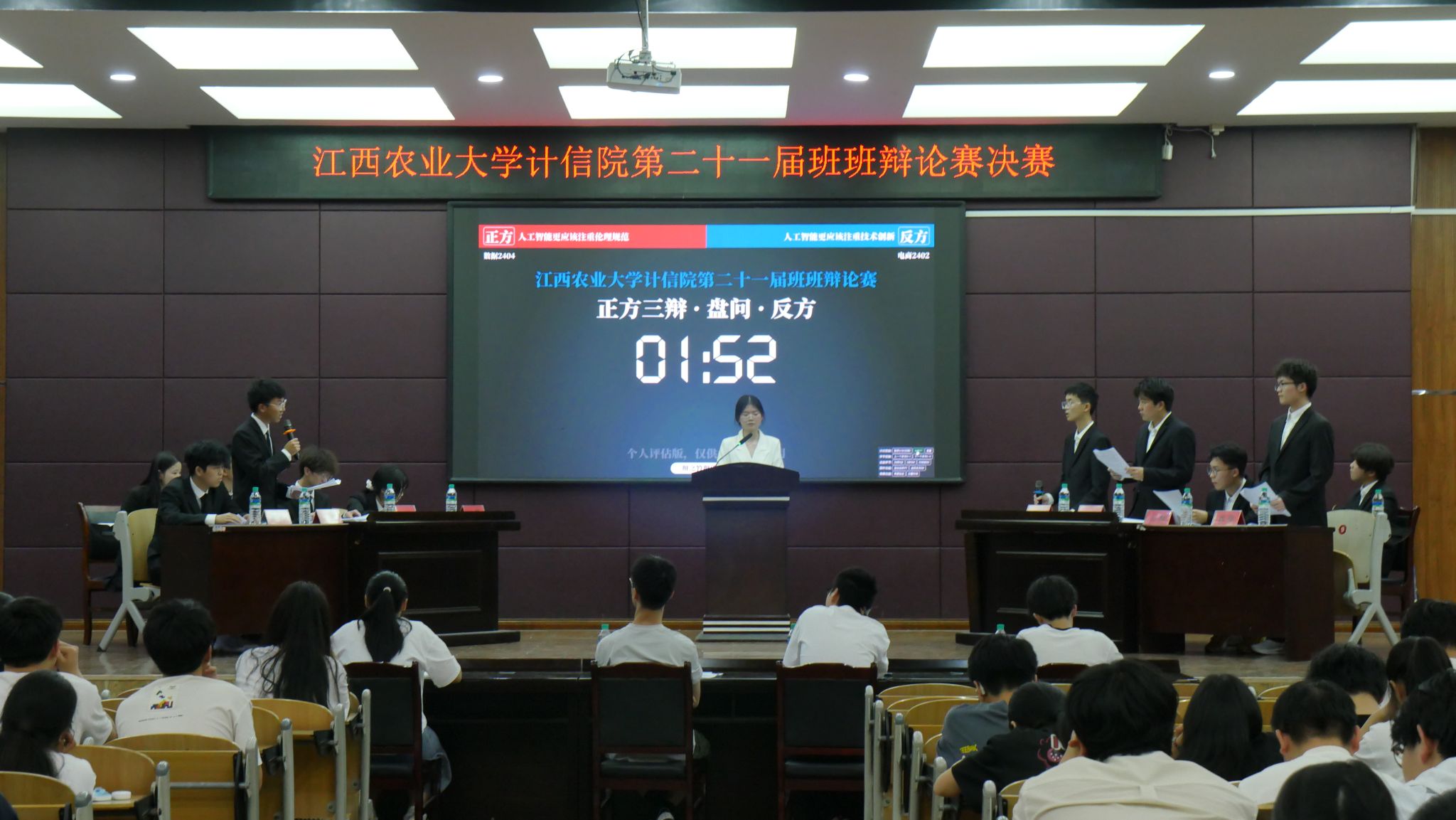 比赛伊始,主持人清晰地介绍了比赛规则、评分标准等重要事项,为比赛有序开展奠定基础。经过前期多轮激烈角逐,电商2402班与数据2404班脱颖而出,会师决赛。双方围绕“人工智能应更注重道德伦理还是科技发展”这一前沿论题展开巅峰对决。比赛分为知己知彼、对辩盘问、自由辩论、一锤定音等环节,双方辩友你来我往,妙语连珠。在随后的自由辩论时,更是围绕辩题深入交锋,凭借出色的临场应变和语言组织能力,将现场气氛推向高潮。双方引经据典,凭借清晰的逻辑和出色的口才,为大家带来了一场精彩的思想交锋。